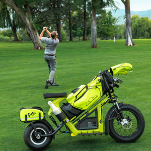 Powered by a 1000 watt-hour lithium battery, Finn also comes with a motorcycle-style front suspension and rear shock absorber for a smooth ride, and its low PSI tires minimize turf impact. Cap it off with front and rear disc brakes for reliable stopping power, and you're ready to hit the front and back nine!