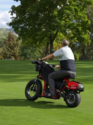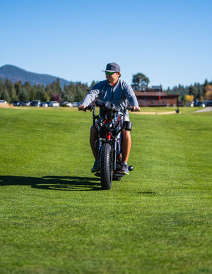 Powered by a 1000 watt-hour lithium battery, Finn also comes with a motorcycle-style front suspension and rear shock absorber for a smooth ride, and its low PSI tires minimize turf impact. Cap it off with front and rear disc brakes for reliable stopping power, and you're ready to hit the front and back nine!